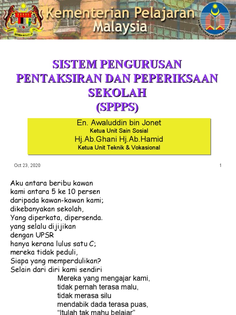 Sudah seminggu Sistem Pengurusan Pentaksiran Berasaskan Sekolah SPPBS dilancarkan secara rasmi oleh Timbalan Perdana Menteri merangkap Menteri Pelajaran Malaysia iaitu Tan Sri Haji Muhyiddin bin Haji Mohd Yassin. Pentaksiran Berasaskan Sekolah Pbs Lembaga Peperiksaan Kementerian Pelajaran. Pentaksiran Sekolah dilaksana dalam bentuk pentaksiran formatif yang dijalankan seiring dengan proses pengajaran dan pembelajaran atau pentaksiran sumatif di akhir unit pembelajaran semester atau tahun.